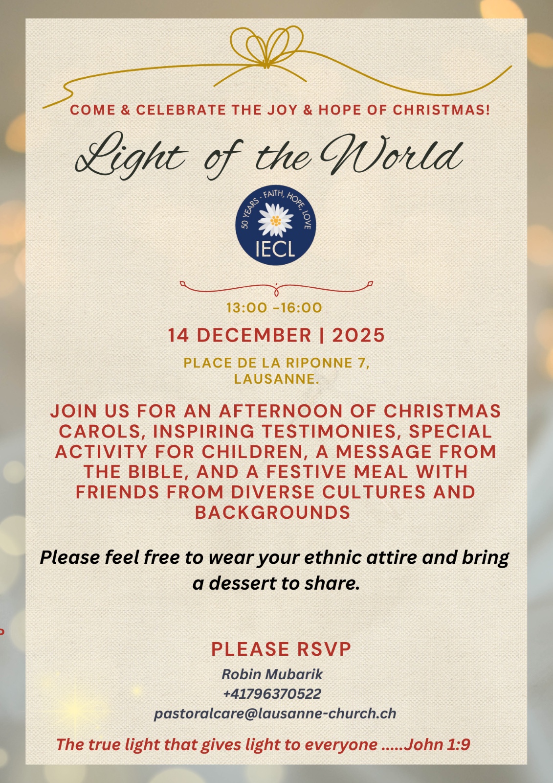 Warm greetings from the IECL pastors and Leadership Team. May our great God bless you and keep you throughout this year. And may you be willing to be used by Him to bless others. At the IECL we value the contributions of everyone. So let us help you to find a place to serve.